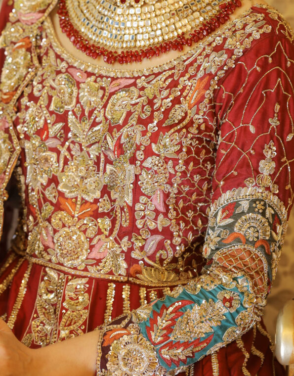 Lehenga: lehenga in Red color is emblazoned with dabka, sequins, crystals with raw silk heavy embroidered patchwork. The fabric used for the lehenga is raw silk. This lehenga is a decadent choice for Barat events.