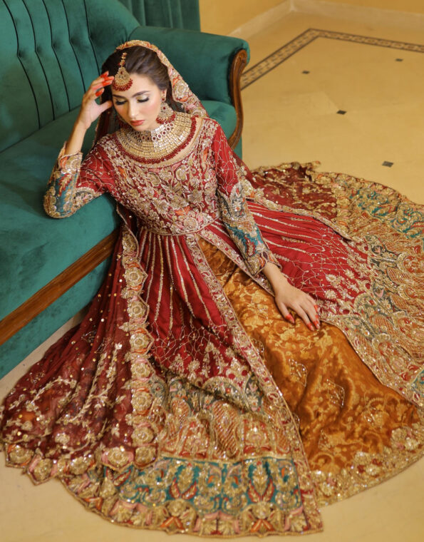 The bold and regal ensemble,dress is a paneled back trail lengha with sprawling hand crafted embellishments. An opulent statement design is paired with an accent color dupatta, the perfect hue of pink and minty green. Intricately embellished all around the border and glittering spray throughout.