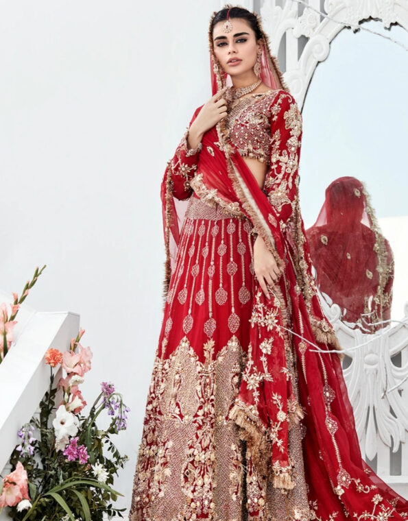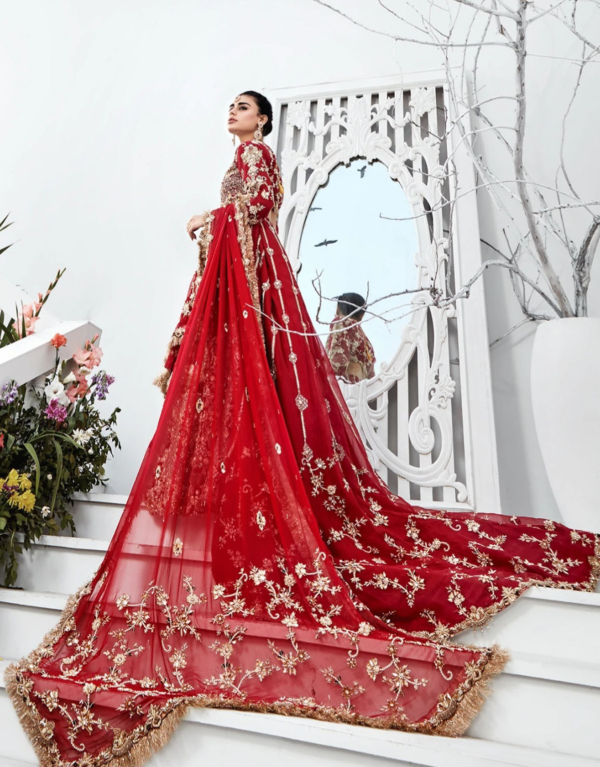 Farshi Gharara Kameez Red Bridal Dress Pakistani is a breathtaking attire to wear on your big day. This alluring masterpiece gives you the exquisite appearance that you’ve always dreamed of. Farshi Gharara paired with embellished kameez creates a stunning royal look.