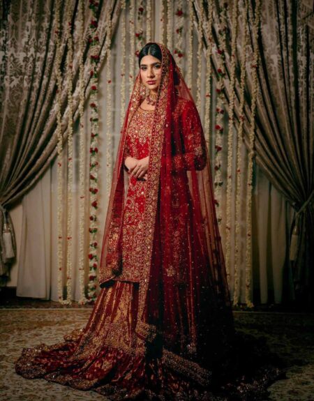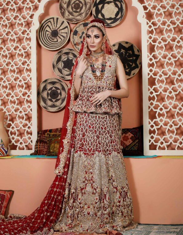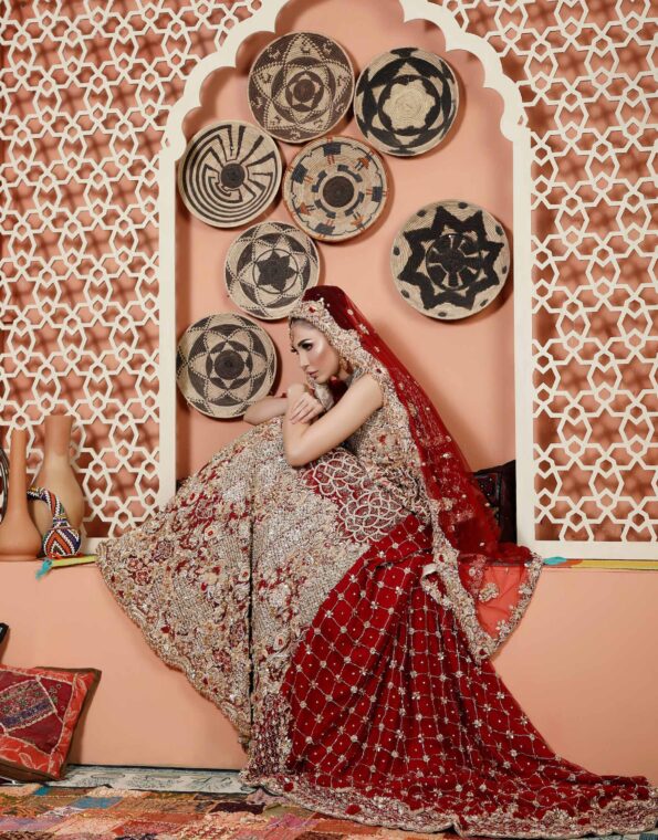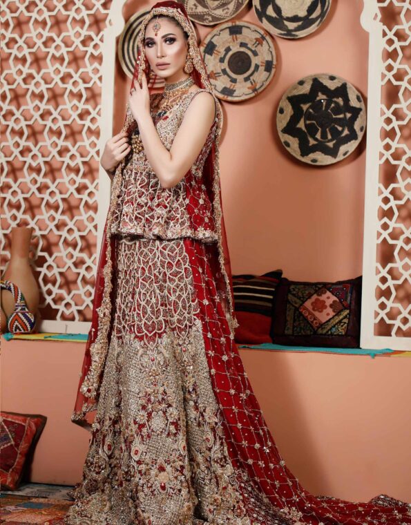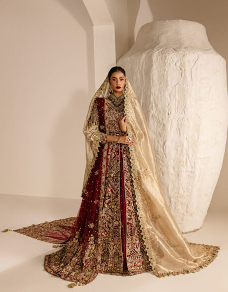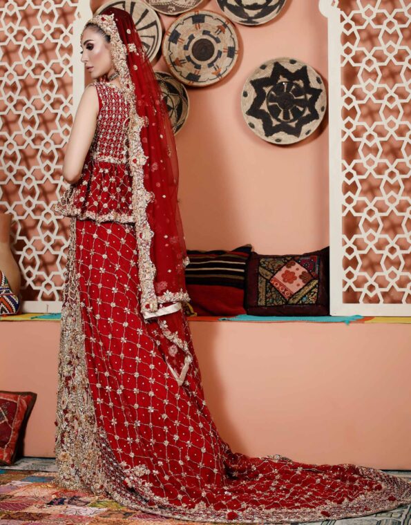 A glorious, traditional masterpiece. Haris Ahmed introduces the perfect piece for the Classic bride. This deep red ‘zardozi’ worked shirt with hints of red antique ‘resham’ paired with a traditional heavily worked ‘farshi Gharara’ is exquisite. It is further beautified with a heavily worked net dupatta with beautiful borders and a classic chan created using loaded technique of embroidery. Regality knows no bounds in this grand and magical piece, perfect for the bride looking for a old wordly aura on her big day.