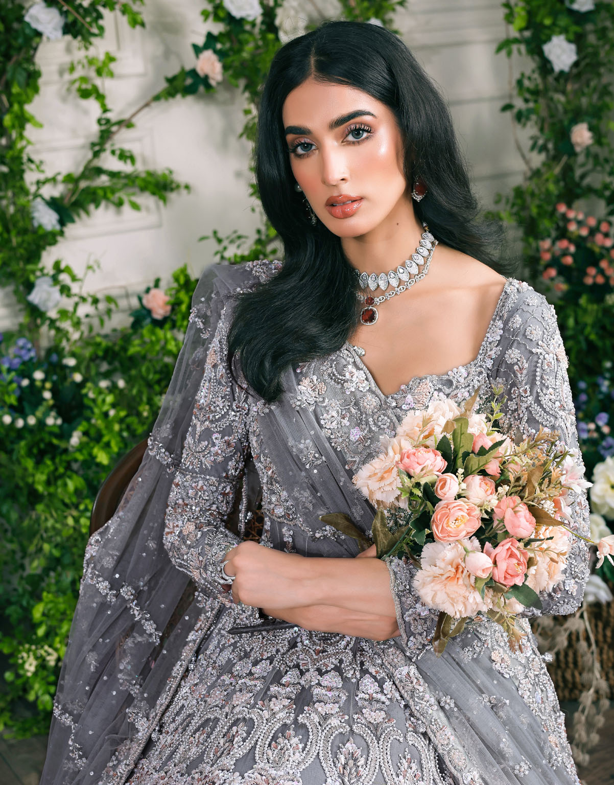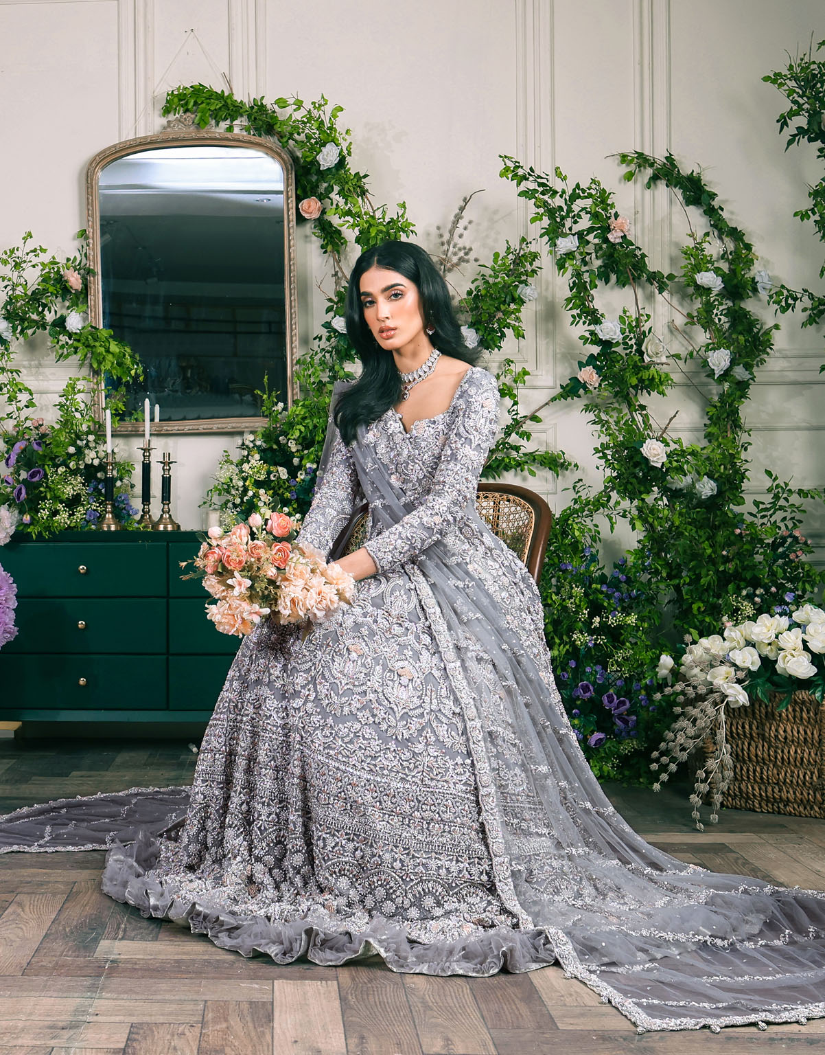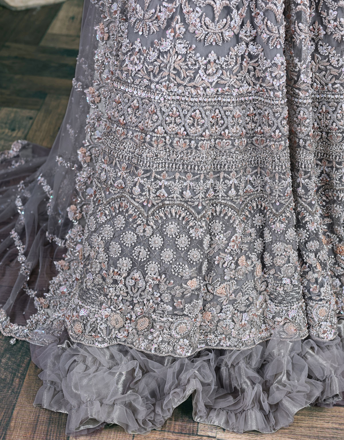 The bold and regal ensemble,dress is a paneled back trail lengha with sprawling hand crafted embellishments. An opulent statement design is paired with an accent color dupatta, the perfect hue of pink and minty green. Intricately embellished all around the border and glittering spray throughout.