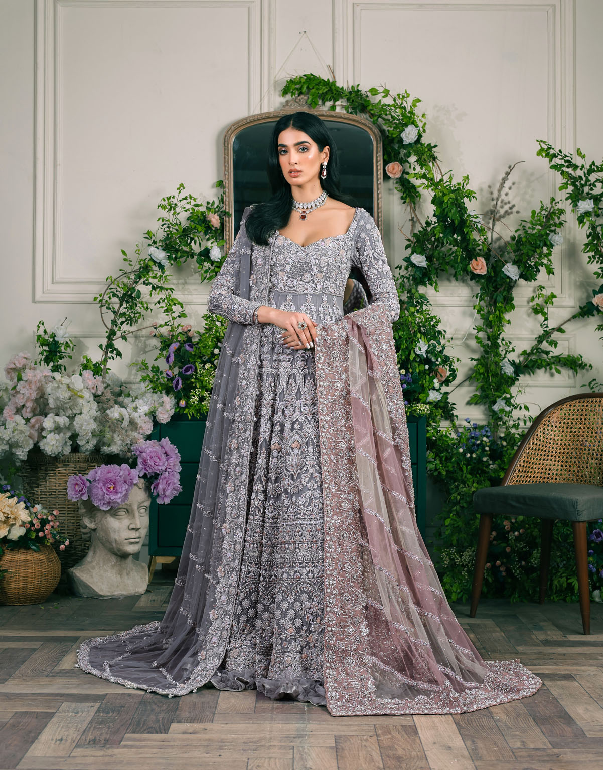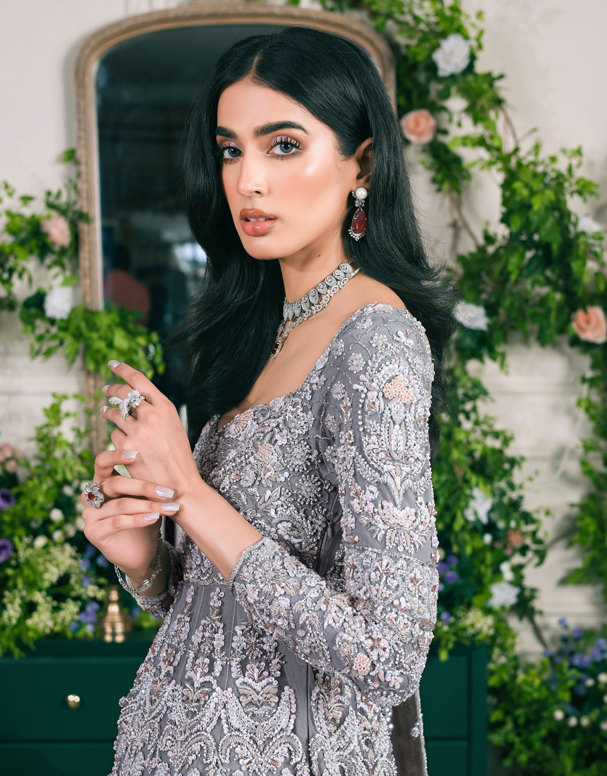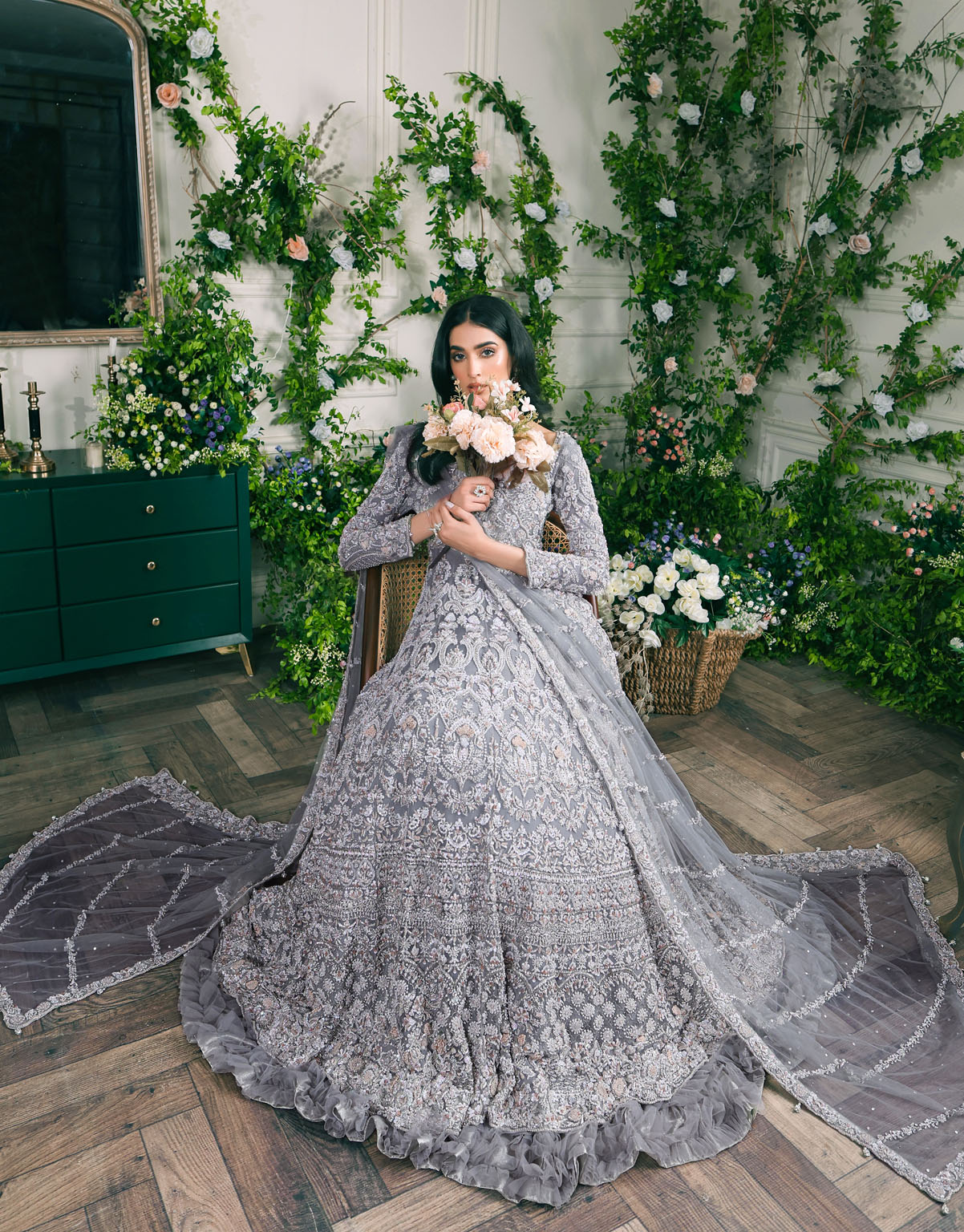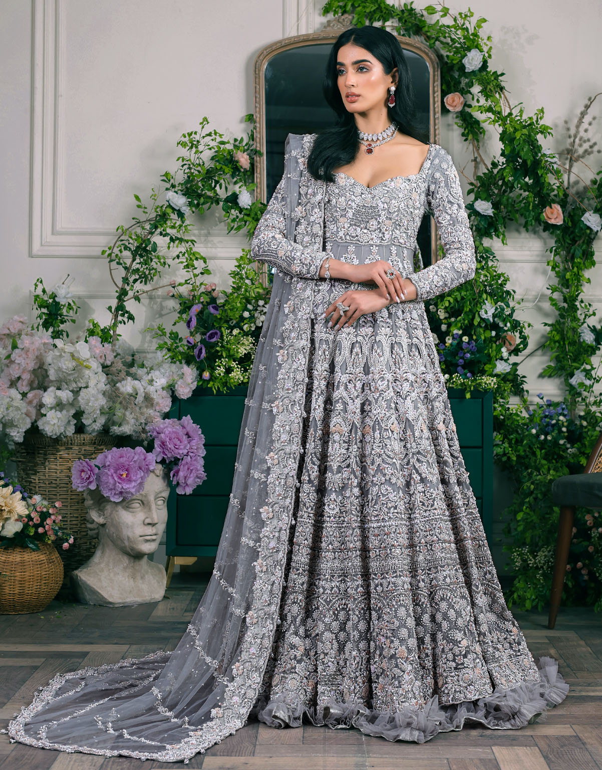 The bold and regal ensemble,dress is a paneled back trail lengha with sprawling hand crafted embellishments. An opulent statement design is paired with an accent color dupatta, the perfect hue of pink and minty green. Intricately embellished all around the border and glittering spray throughout.