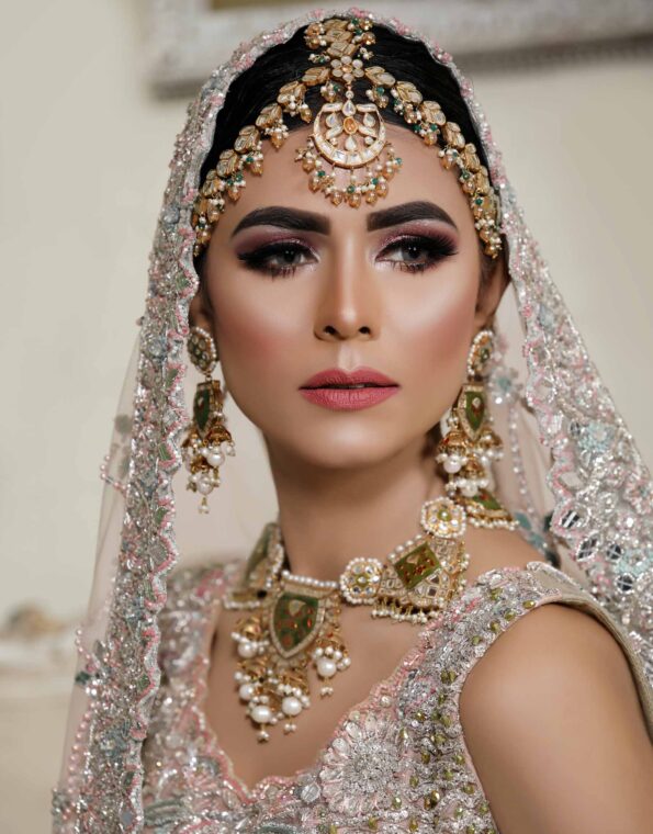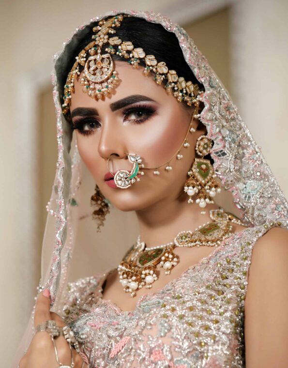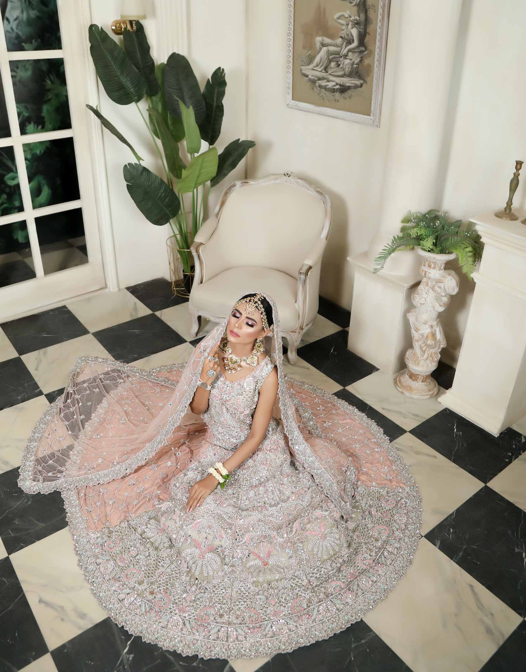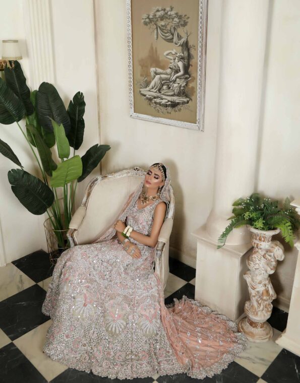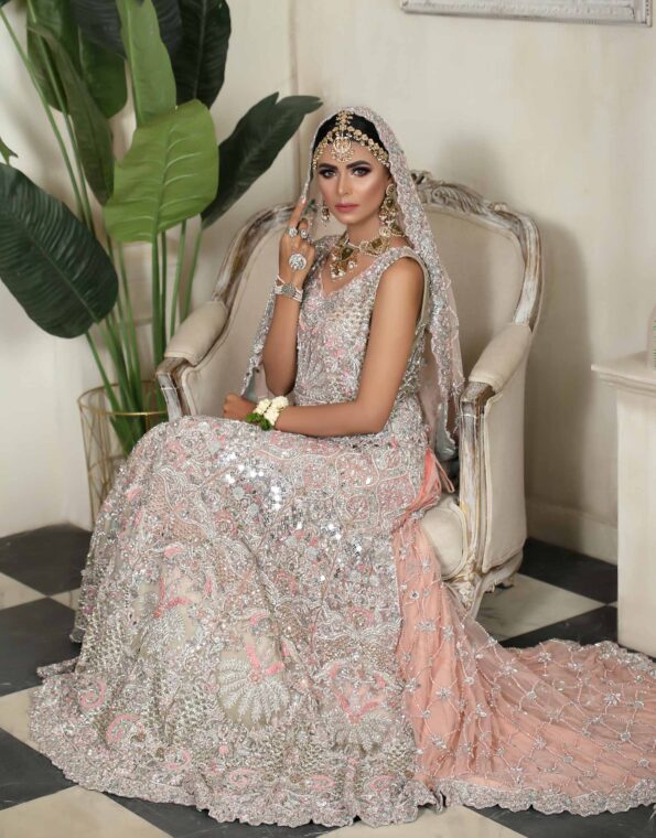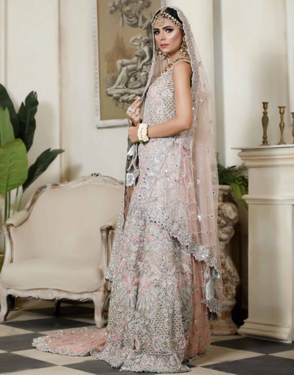 The bold and regal ensemble,dress is a paneled back trail lengha with sprawling hand crafted embellishments. An opulent statement design is paired with an accent color dupatta, the perfect hue of pink and minty green. Intricately embellished all around the border and glittering spray throughout.