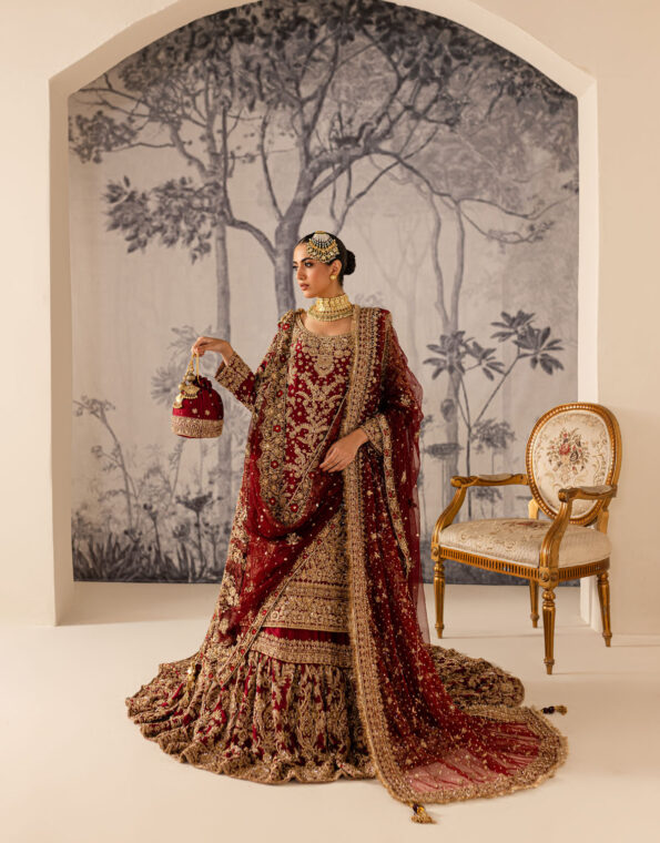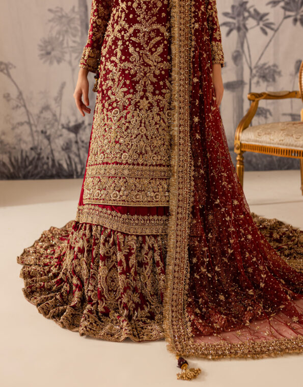 A glorious, traditional masterpiece. Haris Ahmed introduces the perfect piece for the Classic bride. This deep red ‘zardozi’ worked shirt with hints of red antique ‘resham’ paired with a traditional heavily worked ‘farshi Gharara’ is exquisite. It is further beautified with a heavily worked net dupatta with beautiful borders and a classic chan created using loaded technique of embroidery. Regality knows no bounds in this grand and magical piece, perfect for the bride looking for a old wordly aura on her big day.