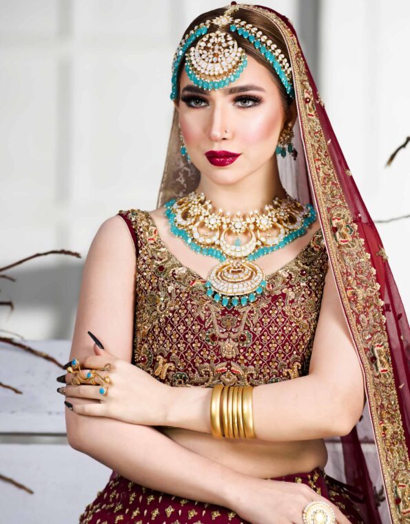 Lehenga: When the heavily embellished kameez is paired with a Farshi lehenga overall traditional look of the attire is completed. The Bridal lehenga is in luxurious Jamawar fabric. Applique work and hand-crafted gold work details on this lehenga give a perfect look.