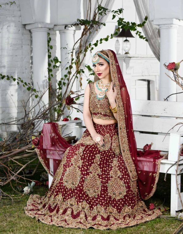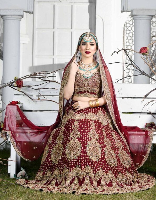 Dupatta: chiffon fabric with heavy chann, starts embellished with Swarovski, resham, sequin & dabka boti. Border heavily embellished with dabka, sequins, Swarovski, and resham. Base colour- Maroon