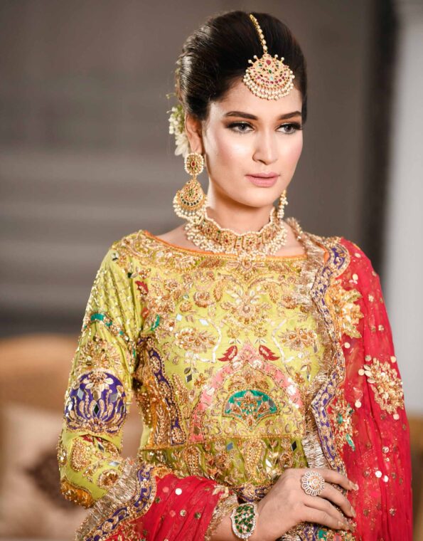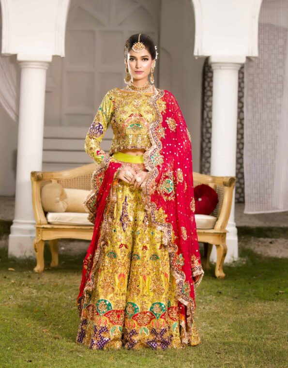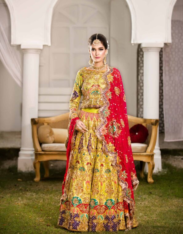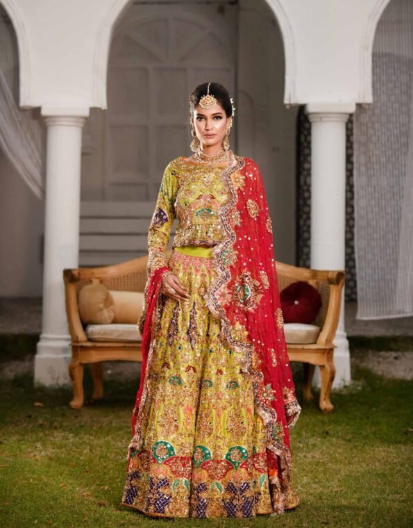 Farshi lehenga Kameez Red and blue Dress Pakistani is a breathtaking attire to wear on your big day. This alluring masterpiece gives you the exquisite appearance that you’ve always dreamed of. Farshi lehenga paired with embellished kameez creates a stunning royal look.