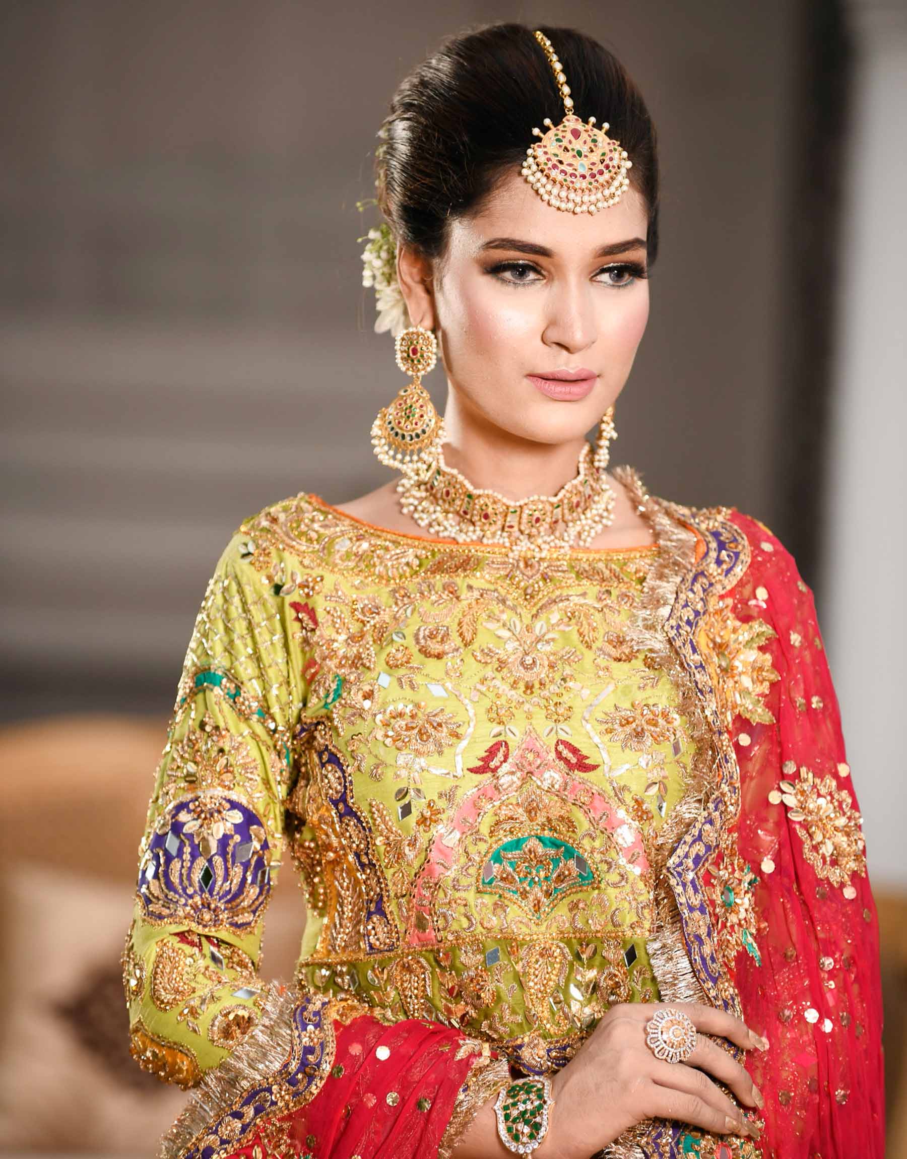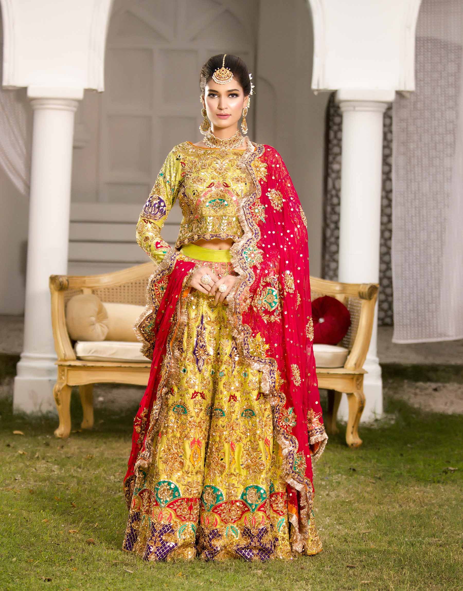 Lehenga: When the heavily embellished kameez is paired with a Farshi lehenga overall traditional look of the attire is completed. The Bridal lehenga is in luxurious Jamawar fabric. hand-crafted gold work details on this lehenga give a perfect look.