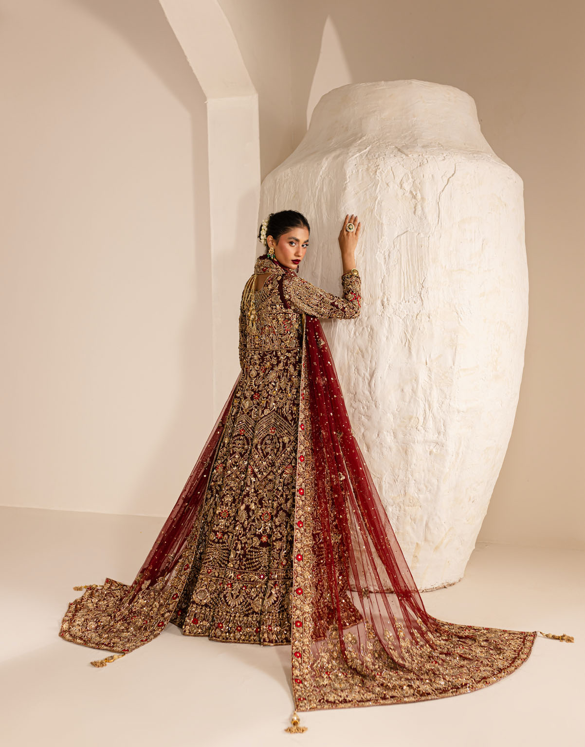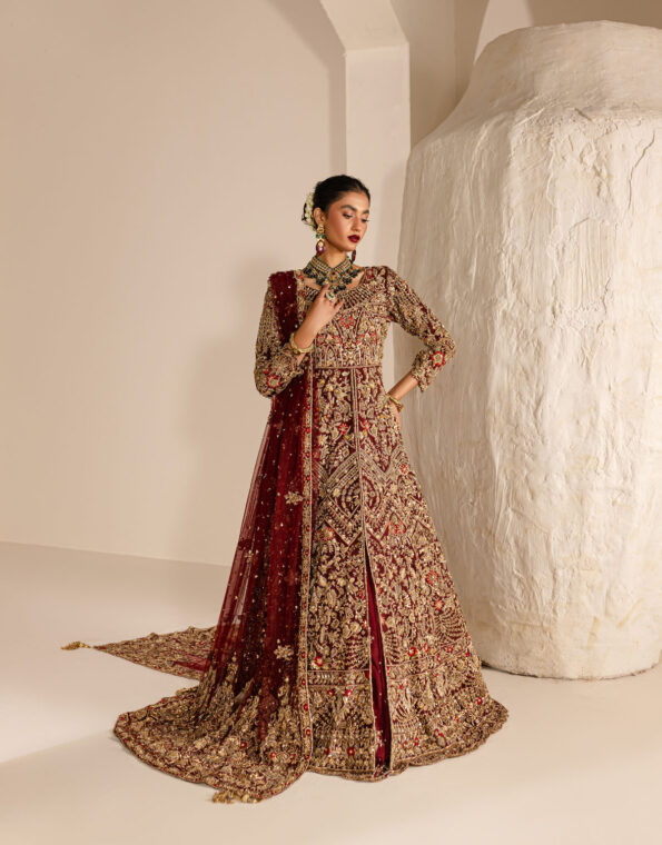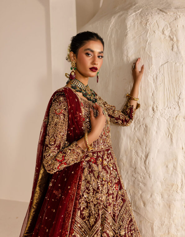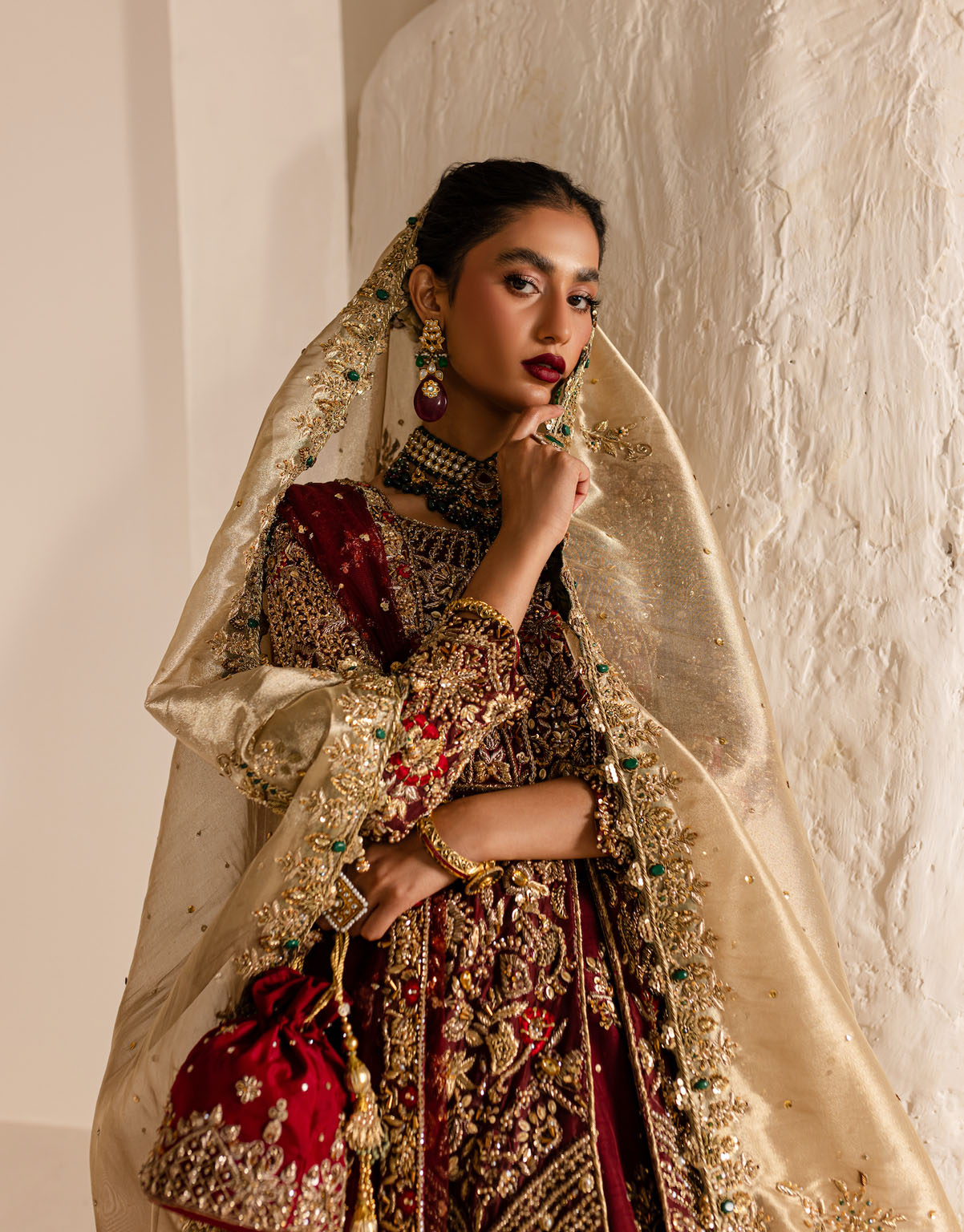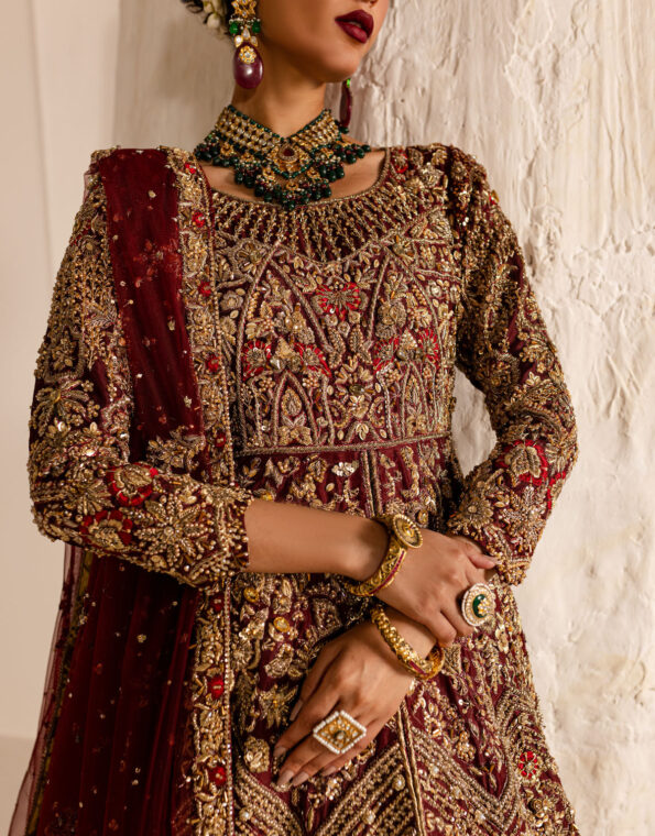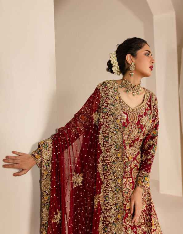 A glorious, traditional masterpiece. Haris Ahmed introduces the perfect piece for the Classic bride. This deep red ‘zardozi’ worked shirt with hints of red antique ‘resham’ paired with a traditional heavily worked ‘farshi Gharara’ is exquisite. It is further beautified with a heavily worked net dupatta with beautiful borders and a classic chan created using loaded technique of embroidery. Regality knows no bounds in this grand and magical piece, perfect for the bride looking for a old wordly aura on her big day.