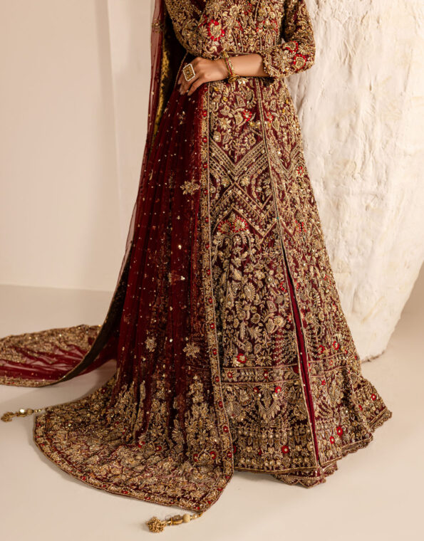 Dupatta: chiffon fabric with heavy chann, starts embellished with Swarovski, resham, sequin & dabka boti. Border heavily embellished with dabka, sequins, Swarovski, and resham. Base colour- Maroon