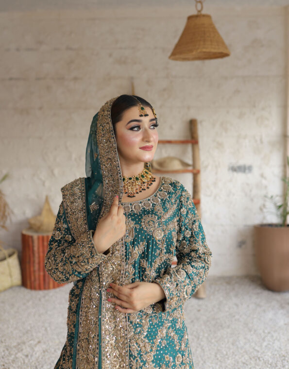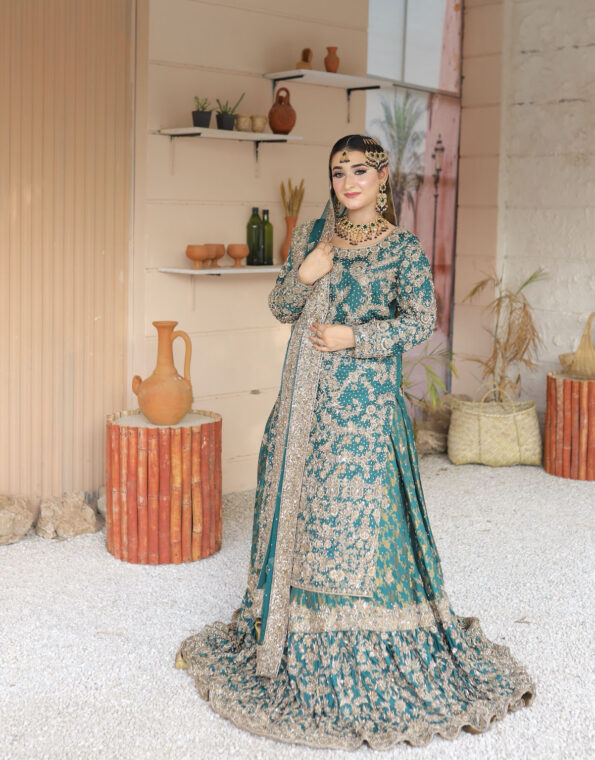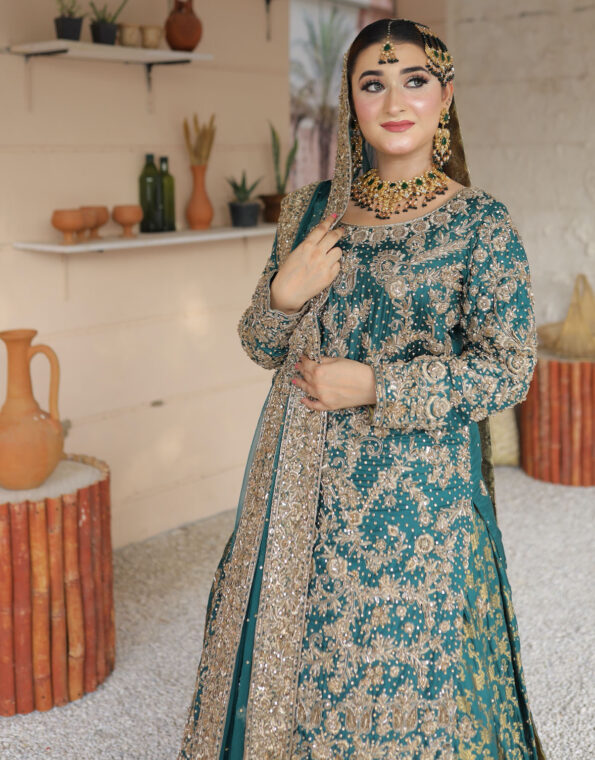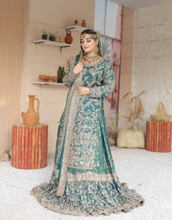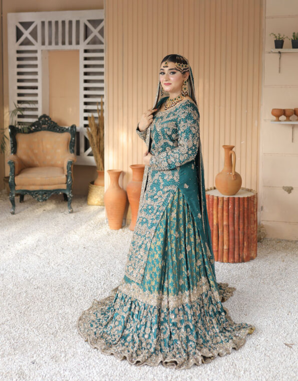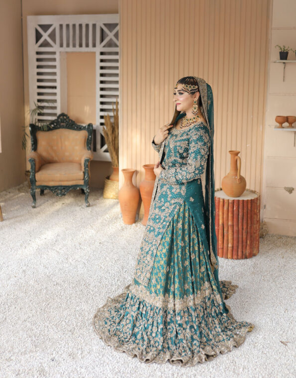 The bold and regal ensemble,dress is a paneled back trail lengha with sprawling hand crafted embellishments. An opulent statement design is paired with an accent color dupatta, the perfect hue of pink and minty green. Intricately embellished all around the border and glittering spray throughout.