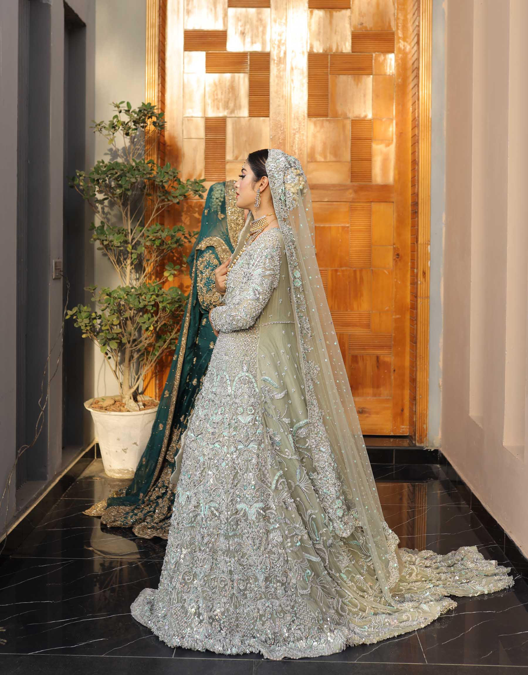 Afsaneh:Choli lengha is stunningly designed to make you look amazing. The gorgeous bridal lengha choli delivers a lavish final impression when paired with net duppata in lilac color.