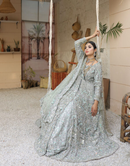 Bridal Lehenga Choli Dress is a stunning choice to wear on Mehndi or any formal event. This beautiful Pakistani Bridal Dress is emblazoned with handcrafted details of mirror work, naqshi, dabka, gota, beads, and Sitara work creating a breathtaking masterpiece for the day.